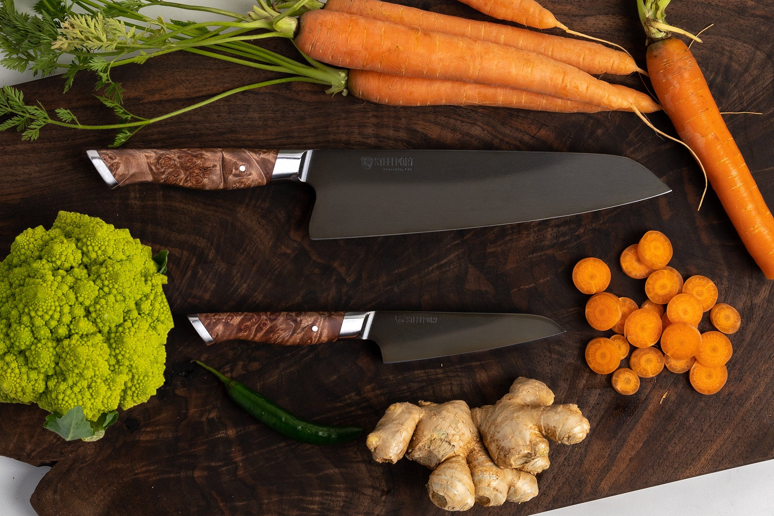 Our handles are contoured to accommodate any hand. For all STEELPORT handles, we use Oregon Big Leaf Maple Burl, a locally sourced, naturally unique burl wood, stabilized with resin to meet tough kitchen requirements and won’t shrink or swell.
